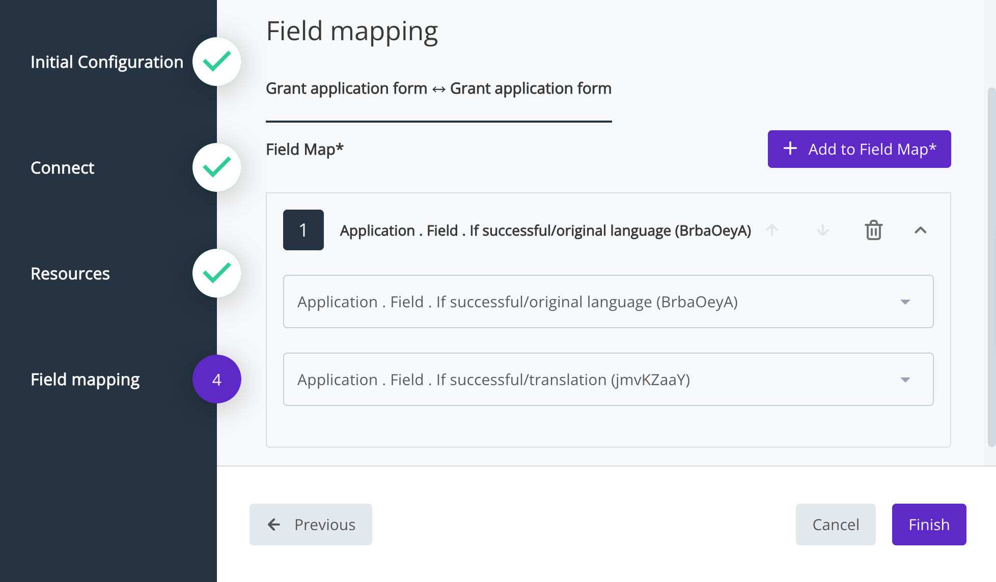 - The 'Field mapping' tab is where you will choose which original language field should be translated into which translated field--click Add to Field Map for each field you wish to translate and pair your original fields with their translation counterparts