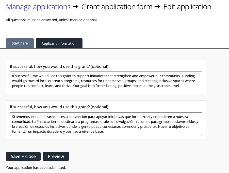 Once configured, when an application is submitted the selected fields will be translated into your target language.