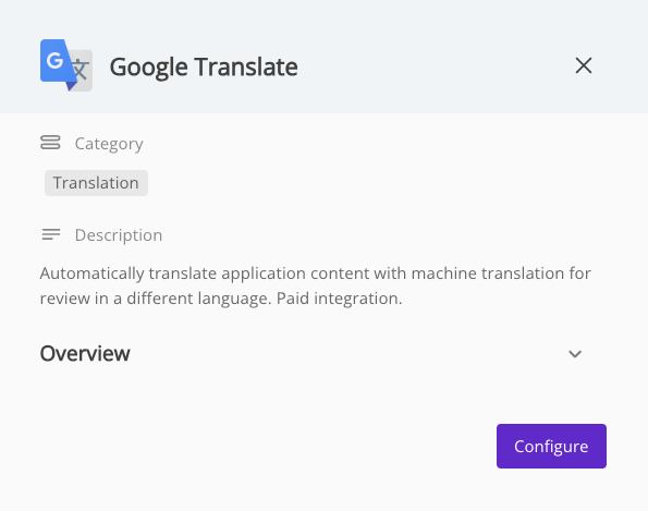 - From the Manage workspace, go to Settings > Integrations > Marketplace and click Google Translate