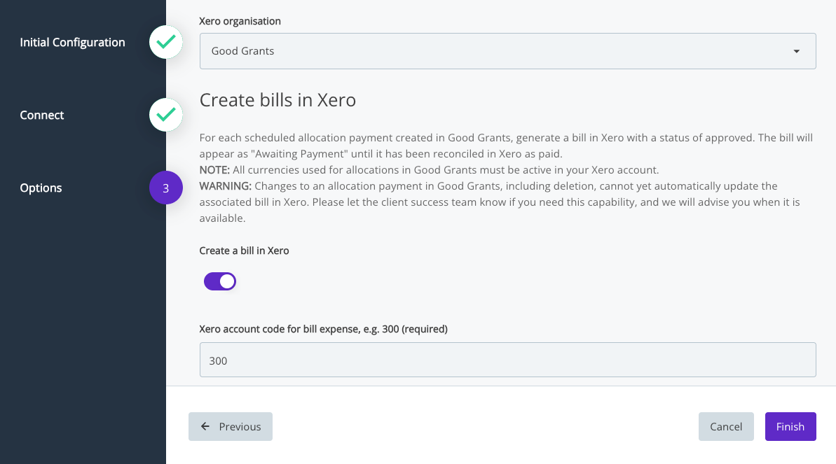 - In the 'Options' tab select your Xero organisation and choose which flows you would like to enable--if you want to Create a bill in Xero when an allocation payment is created in Good Grants your bill account code can be configured
