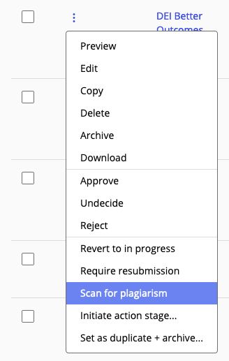 Fields of type Text area (multi-line) and File upload (single) have an option to Scan for plagiarism: